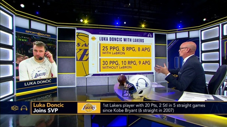 據(jù)統(tǒng)計(jì),在東契奇加盟湖人后,在他和詹姆斯同時(shí)出場(chǎng)的比賽中,東契奇場(chǎng)均25分8籃板8助攻;在詹姆斯缺席的比賽中,東契奇場(chǎng)均30分10籃板9助攻。