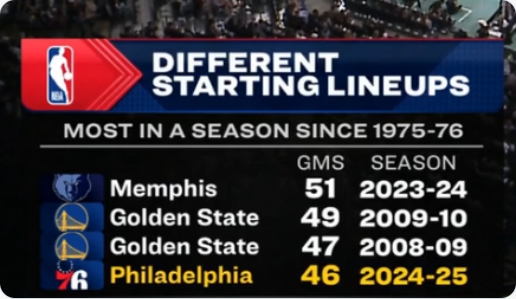 傷兵滿營!76人本賽季70場比賽排出46套首發(fā) 49年來歷史第四多