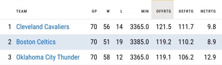 3月22日訊 NBA常規(guī)賽,雷霆在主場141-106大勝黃蜂。到目前為止,雷霆的進攻效率為119.1(每百回合得分),高居聯(lián)盟第三,僅次于騎士和凱爾特人;防守效率為106.2(每百回合失分),高居聯(lián)盟第一;凈效率12.9(每百回合凈勝分)也是聯(lián)盟第一。 本文標簽: 籃球 NBA 雷霆