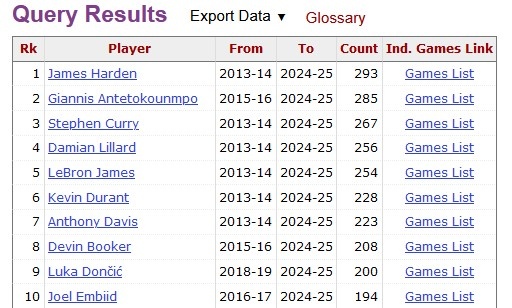 2014年至今聯(lián)盟球員30+場(chǎng)次數(shù)榜:哈登294第一 字母第二 庫里第三