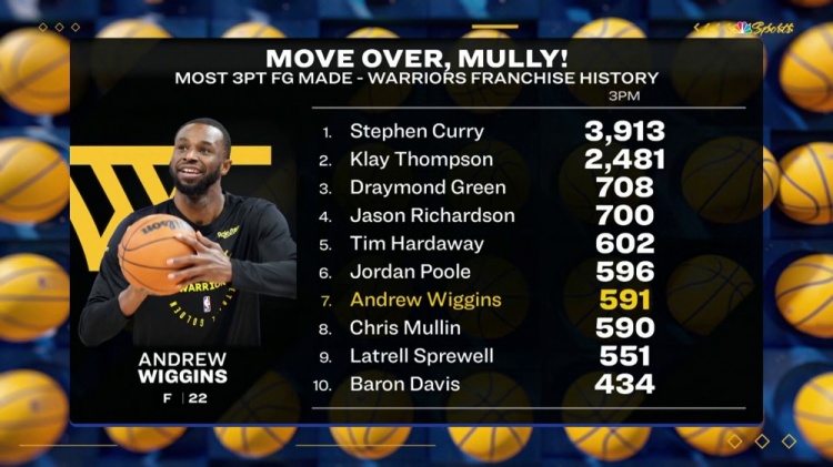 據(jù)統(tǒng)計(jì),本場過后維金斯升至勇士隊(duì)史三分命中數(shù)榜單第7位。具體排名如下: