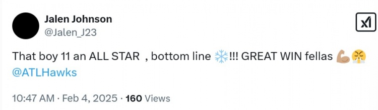 2月4日訊 NBA常規(guī)賽,老鷹132-130險勝活塞。本場比賽,老鷹球星特雷-楊表現(xiàn)出色,末節(jié)命中關鍵三分反超并投進絕殺后仰跳投,在35分鐘的時間里,投籃16中9,三分球8中4,罰球14中12,砍下34分9助攻。賽后,老鷹前鋒杰倫-約翰遜更推道:“那個11號男孩是全明星,最差都應該是?。?!非常棒的勝利???????????? 。” 本文標簽: NBA 籃球 老鷹 特雷-楊