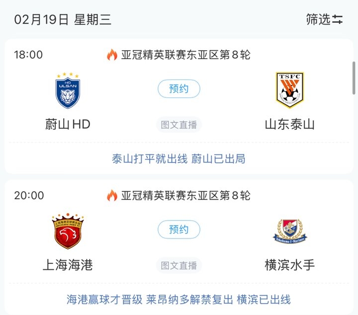 泰山和海港都將在明天出戰(zhàn),泰山只要不輸球就能拿到晉級(jí)名額,而海港需要3分才能升入晉級(jí)區(qū)。只要泰山輸球或海港不勝,申花就能晉級(jí)到淘汰賽階段。