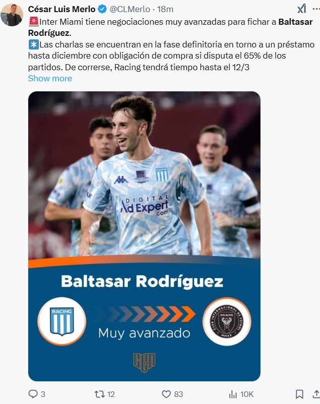 2月18日訊 記者César Luis Merlo消息,邁阿密?chē)?guó)際正在就簽下21歲中場(chǎng)巴爾塔薩爾-羅德里格斯進(jìn)行深入談判。