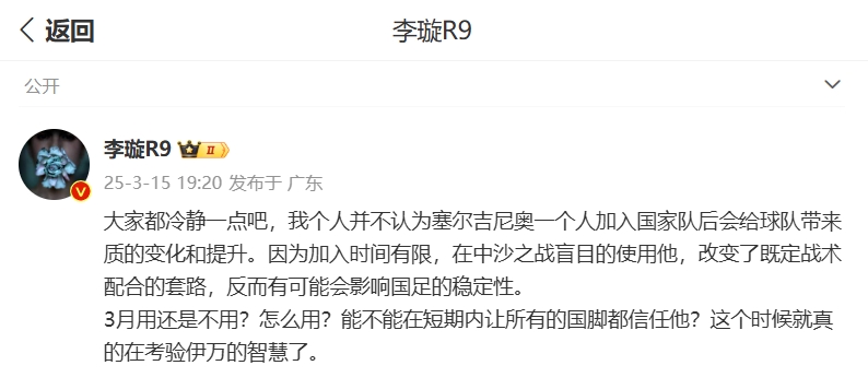 李璇寫道:大家都冷靜一點(diǎn)吧,我個(gè)人并不認(rèn)為塞爾吉尼奧一個(gè)人加入國(guó)家隊(duì)后會(huì)給球隊(duì)帶來質(zhì)的變化和提升。因?yàn)榧尤霑r(shí)間有限,在中沙之戰(zhàn)盲目的使用他,改變了既定戰(zhàn)術(shù)配合的套路,反而有可能會(huì)影響國(guó)足的穩(wěn)定性。
