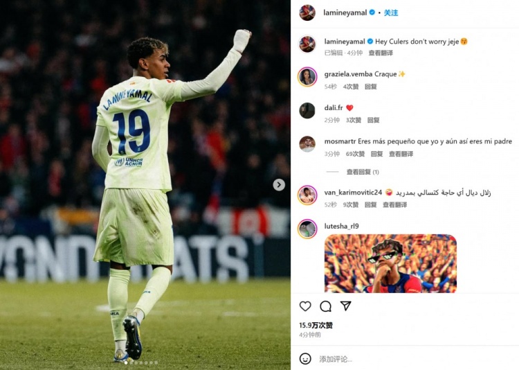 數(shù)據(jù)統(tǒng)計(jì)顯示,亞馬爾也就此結(jié)束了長(zhǎng)達(dá)4個(gè)半月的西甲進(jìn)球荒,他本人也通過(guò)社媒曬照慶祝:“嘿,巴薩球迷們,別擔(dān)心,哈哈????”。