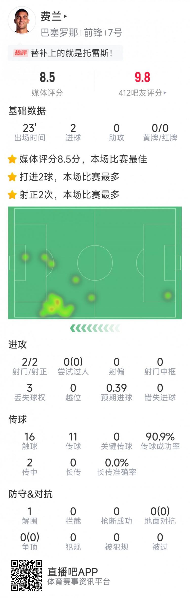 3月17日訊 在本輪西甲巴薩4-2擊敗馬競的比賽中,費蘭替補登場梅開二度,以下為他在本場數據:比賽時間23分鐘2粒進球2次射門均射正16次觸球傳球成功率90.9%1次解圍評分8.5分 本文標簽: 足球 西甲 巴塞羅那