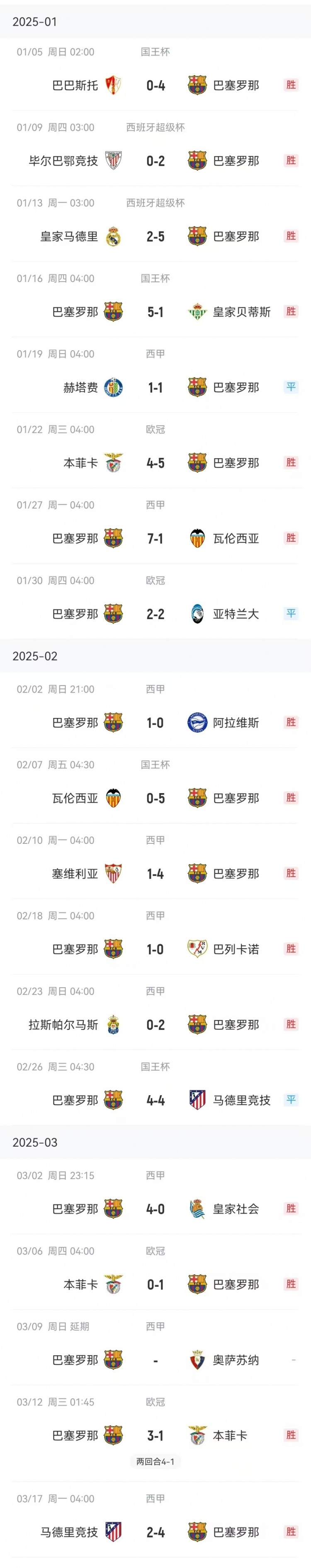 3月17日訊 巴薩在本輪西甲4-2逆轉馬競,延續(xù)了今年的不敗勢頭。數(shù)據(jù)統(tǒng)計顯示,自去年年底2連敗之后,巴薩進入2025年后各項賽事18場不敗。巴薩在此期間取得15勝3平,打進58球僅丟19球。 本文標簽: 足球 西甲 巴塞羅那 馬德里競技