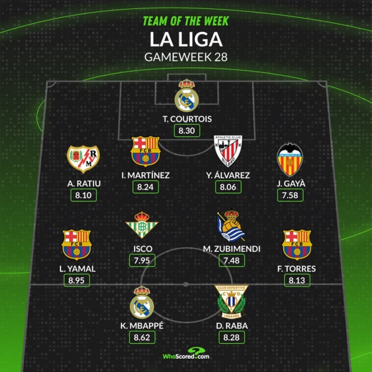 中場(chǎng):亞馬爾(巴薩,8.95分)、伊斯科(貝蒂斯,7.95分)、祖比門(mén)迪(皇社,7.48分)、費(fèi)蘭(巴薩,8.13分)