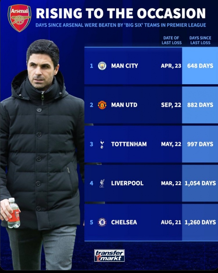 2月2日訊 本輪英超將迎來阿森納與曼城的焦點對決。據(jù)統(tǒng)計,阿森納上一次在英超輸給其他Big6球隊還在23年4月,當時的對手正是曼城。以下為阿森納在英超上一次輸給其他big6球隊的時間以及相隔天數(shù):vs曼城 23年4月,648天vs曼聯(lián) 22年9月,882天vs熱刺 22年5月,997天vs利物浦 22年3月,1054天vs切爾西 21年8月,1260天 本文標簽: 足球 英超 曼城 阿森納