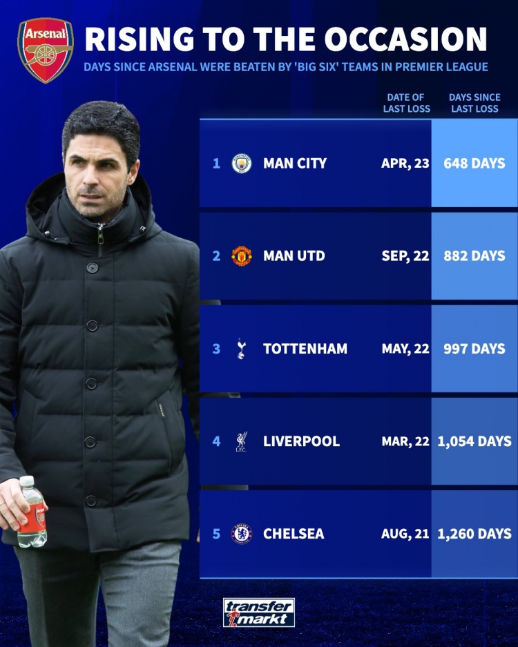 2月2日訊 北京時間明天凌晨0點30分,阿森納將在英超第24輪比賽中主場對陣曼城。據(jù)德國轉(zhuǎn)會市場統(tǒng)計,曼城上一次在英超比賽中擊敗阿森納要追溯到648天之前。BIG6球隊上一次在英超擊敗阿森納時間:曼城——23年4月——648天前曼聯(lián)——22年9月——882天前熱刺——22年5月——997天前利物浦——22年3月——1054天前切爾西——21年8月——1260天前 本文標簽: 足球 英超 阿森納 曼城