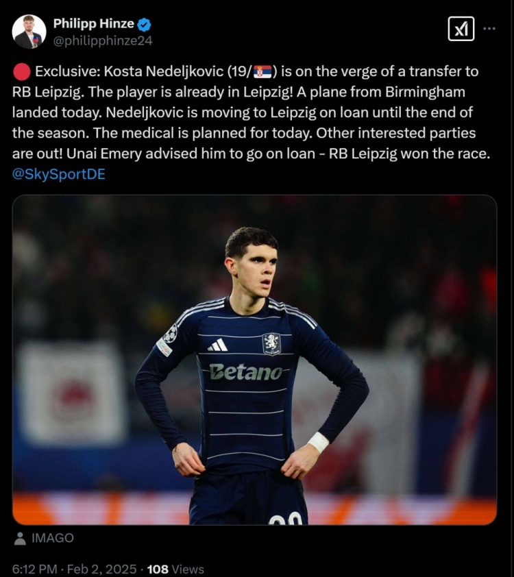 目前,球員已經乘坐飛機從伯明翰抵達了萊比錫。內德伊科維奇將以租借形式加盟萊比錫,直到本賽季結束。球員的體檢計劃在今天進行。維拉主帥埃梅里建議這名小將外租鍛煉,現(xiàn)在?萊比錫贏下了球員爭奪戰(zhàn)。