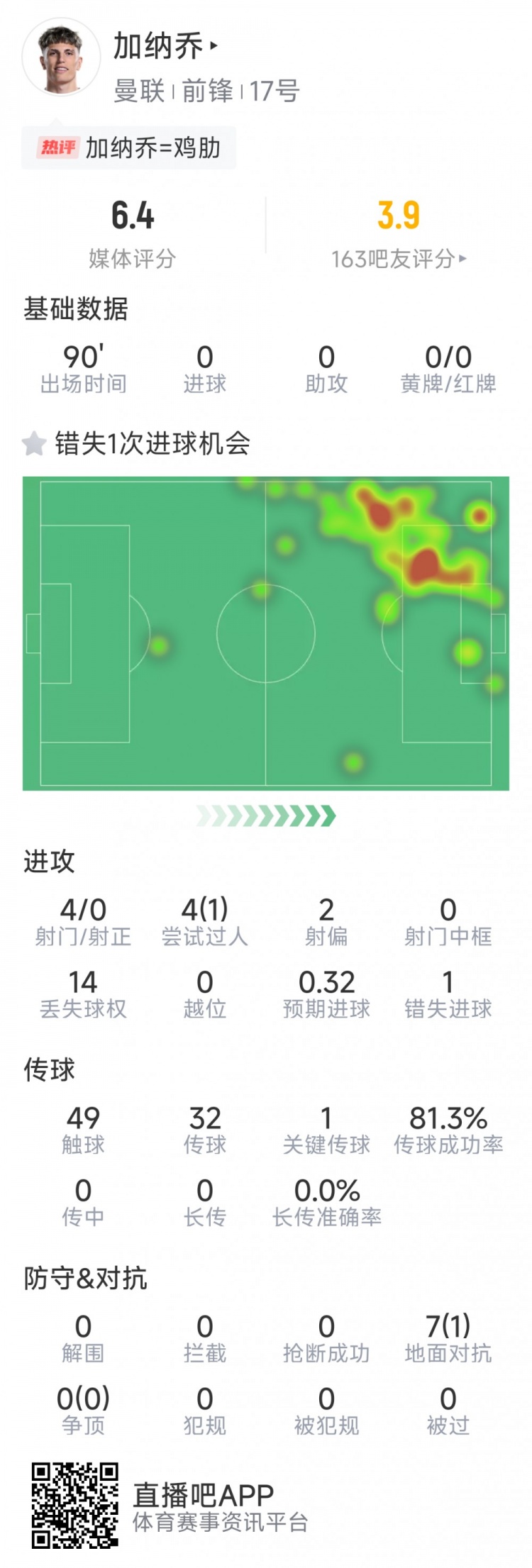 2月3日訊 在本輪英超,曼聯(lián)0-2不敵水晶宮。本場(chǎng)比賽加納喬發(fā)揮不佳,以下為他在本場(chǎng)數(shù)據(jù):