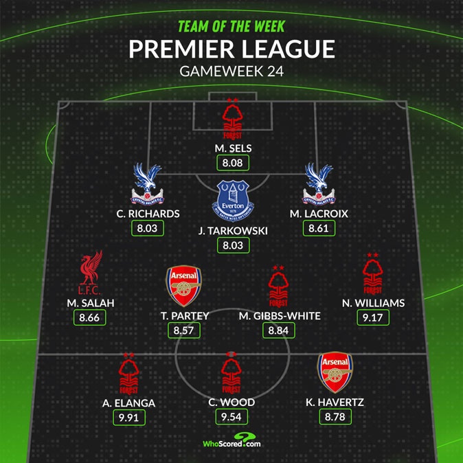 2月4日訊 英超第24輪比賽戰(zhàn)罷,WhoScored根據(jù)球員評(píng)分排出了本輪最佳陣容,薩拉赫、哈弗茨、托馬斯在列,諾丁漢森林5名球員入選。