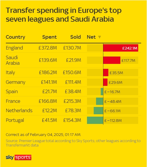 歐洲7大聯(lián)賽+沙特聯(lián)冬窗轉(zhuǎn)會(huì)支出排名(單位:英鎊):