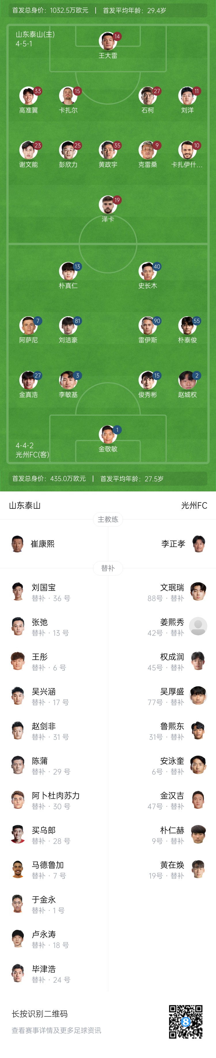 02月11日訊 北京時間今晚20點(diǎn),亞冠精英聯(lián)賽東亞區(qū)第7輪,山東泰山主場迎戰(zhàn)韓國球隊光州FC,賽前雙方公布首發(fā)陣容。